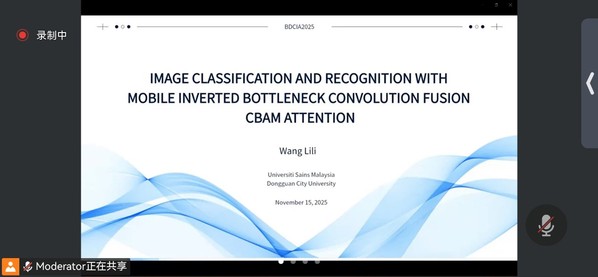 来自马来西亚理科大学和东莞城市大学的Wang Lili(线上)报告了融合移动端倒瓶颈卷积与CBAM注意机制的图像分类与识别技术。