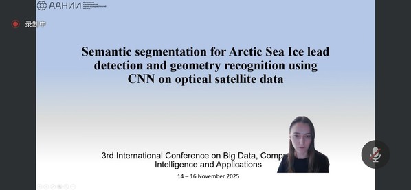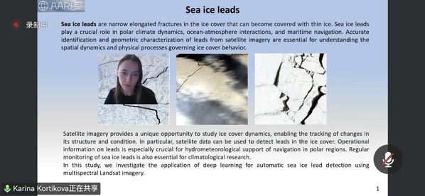 俄罗斯联邦国家科学中心的Karina G. Kortikova(线上)介绍了利用卷积神经网络处理北极海冰光学卫星数据的方法。