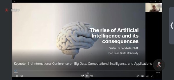此外,英国爱丁堡纳皮尔大学刘晓东教授(线上)、加拿大西蒙弗雷泽大学Ljiljana Trajković教授(线上)、美国圣何塞州立大学Vishnu S. Pendyala博士(线上)、越南维新大学Anand Nayyar教授(线上)也分别就物联网智能系统挑战、网络流量中的数据挖掘与机器学习、人工智能的社会影响、从机器学习到人类水平智能等议题分享了独到见解。