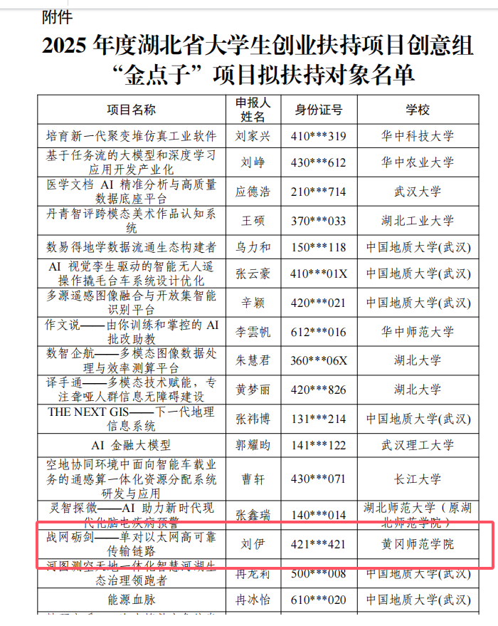 近日,湖北省人力资源和社会保障厅、湖北省教育厅与共青团湖北省委员会联合发布了《2025年度湖北省大学生创业扶持项目创意组“金点子”项目名单公示》。我院软件工程2301班刘伊同学负责的“战网砺剑——单对以太网高可靠传输链路”项目成功入选,充分展现出学院在创新创业教育与学生实践能力培养方面的积极成效。