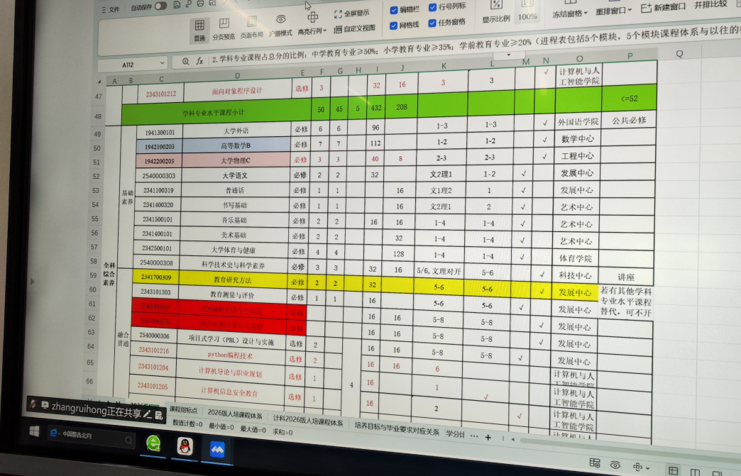 会上,张瑞红老师首先就师范认证 2026 版人才培养方案制定工作进展、框架设计、课程体系构建、实践教学安排、毕业要求拆解等核心内容进行全面汇报,全体认证小组成员逐一交流方案编制过程中遇到的重点、难点问题,围绕培养目标定位、课程模块设置、实践环节衔接、质量评价体系构建等方面展开充分研讨。